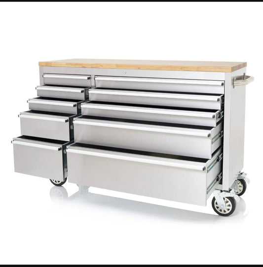 Drawer Mobile Workbench Stainless Steel Toolbox Cabinet with Wood Top (Silver)